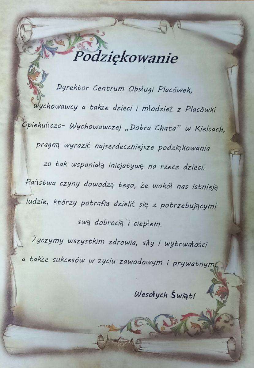 Efektem wielotygodniowej pracy, warsztatów ozdób i stroików, zbiórek pieniężnych a wreszcie Kiermaszu Świątecznego było zebranie pokaźnej kwoty , którą mogliśmy przeznaczyć na zakup prezentów świątecznych dla najbardziej potrzebujących. 19 grudnia udaliśmy się z wizytą i darami na oddział Chirurgii Dziecięcej oraz do Ośrodka Opiekuńczo - Wychowawczego" Dobra Chata" w Kielcach. Niewielką kwotę przeznaczyliśmy również na działalność  Kieleckiego Hospicjum Dziecięcego.