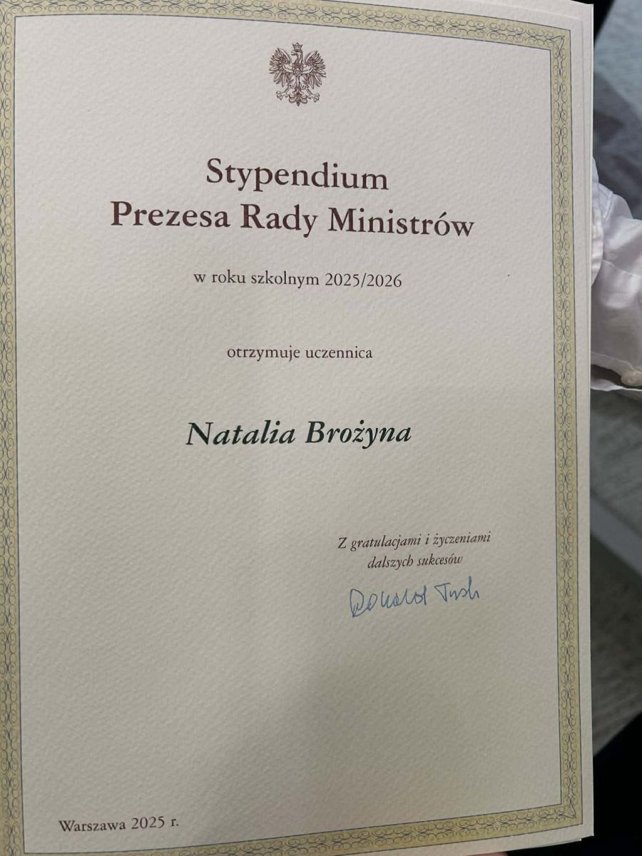 Uczennica kl. III f Natalia Brożyna znalazła się w zacnym gronie uczniów, którzy otrzymali to prestiżowe wyróżnienie.